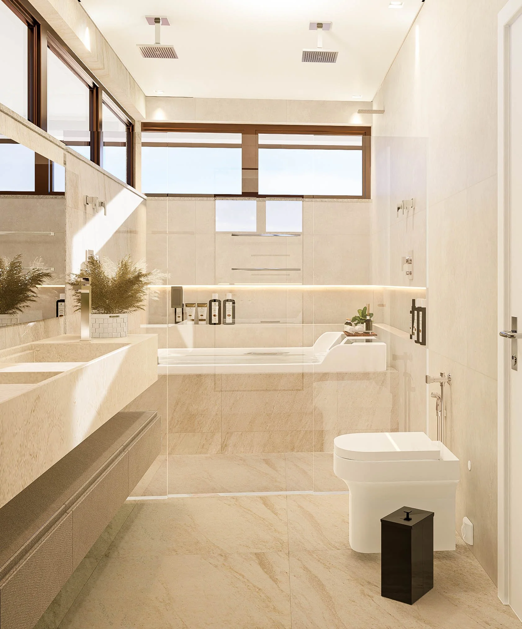 Com escopo completo: social integrado, estar íntimo, cozinha, gourmet que pode ou não ser integrado com a cozinha, escritório, academia, despensa, área de serviço, dce, espaço para jogos, depósitos, sauna, duas suítes hóspedes, suíte filha com closet e suíte master com closet, o maior desafio foi a setorização. A partir do limitador de ocupação do terreno, com um afastamento frontal obrigatório de 15m da avenida da orla, e de sua posição de esquina, começamos definindo os acessos de veículos e de pedestre, para assim seguir com os cômodos sociais, de serviço e por fim, privativos.