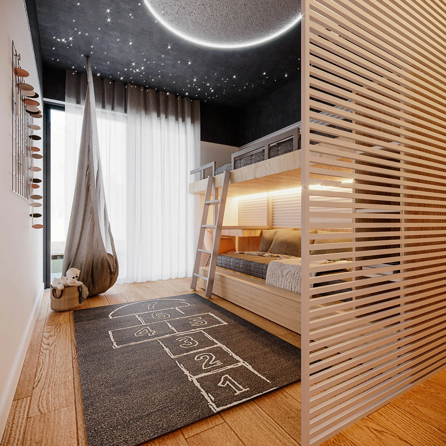 No primeiro bloco posicionamos toda a área social e de serviço da casa, que conta com a garagem/oficina, hall, lavabo, lavanderia, despensa, e uma grande e convidativa sala que integra o estar, jantar, cozinha e o gourmet. Já no segundo bloco dispomos de uma rouparia, um escritório e 3 quartos. Fazendo a ligação dos dois volumes temos um jardim de inverno, que também é responsável por possibilitar o acesso à área íntima independente da parte social da casa.