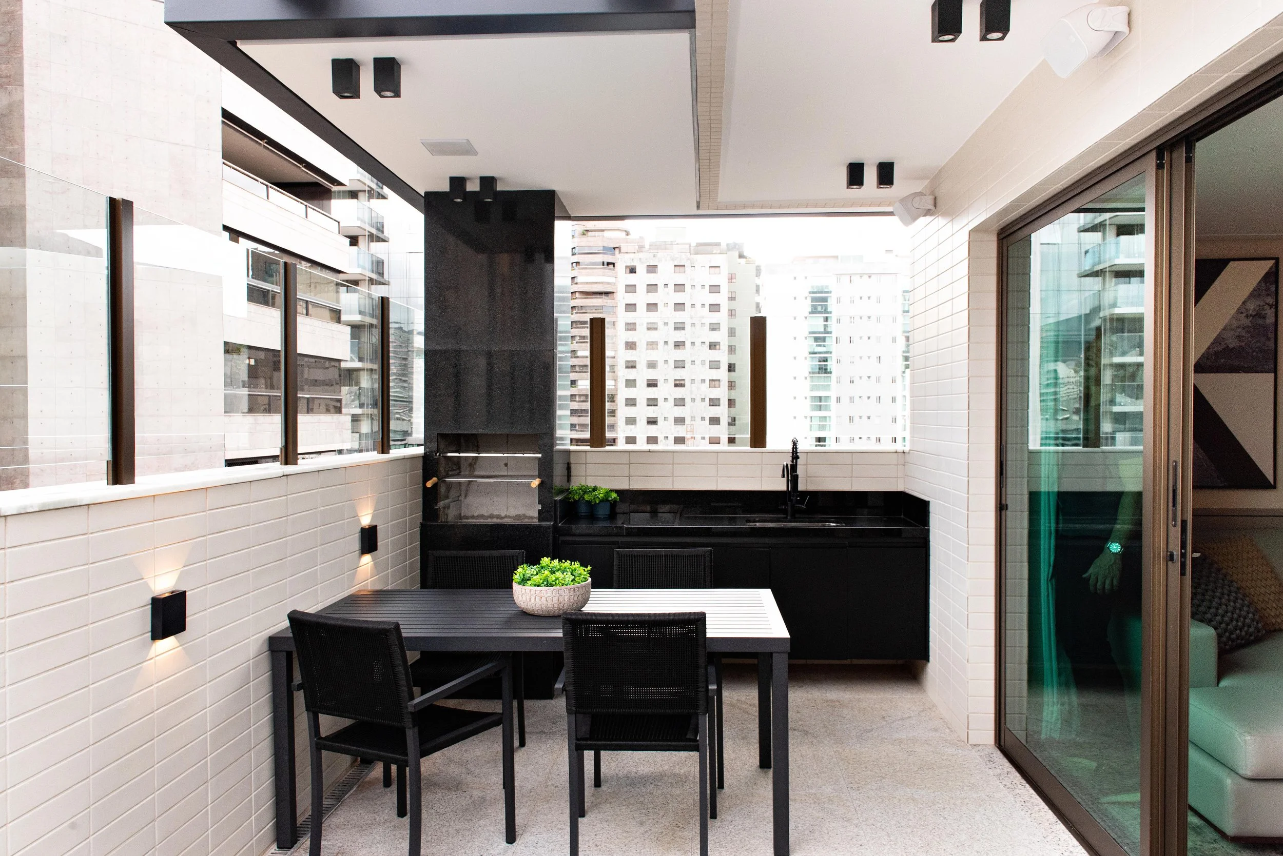 Outro pedido foi uma piscina boa, com integração ao gourmet, mas que fosse grande parte coberta e protegida do sol.
